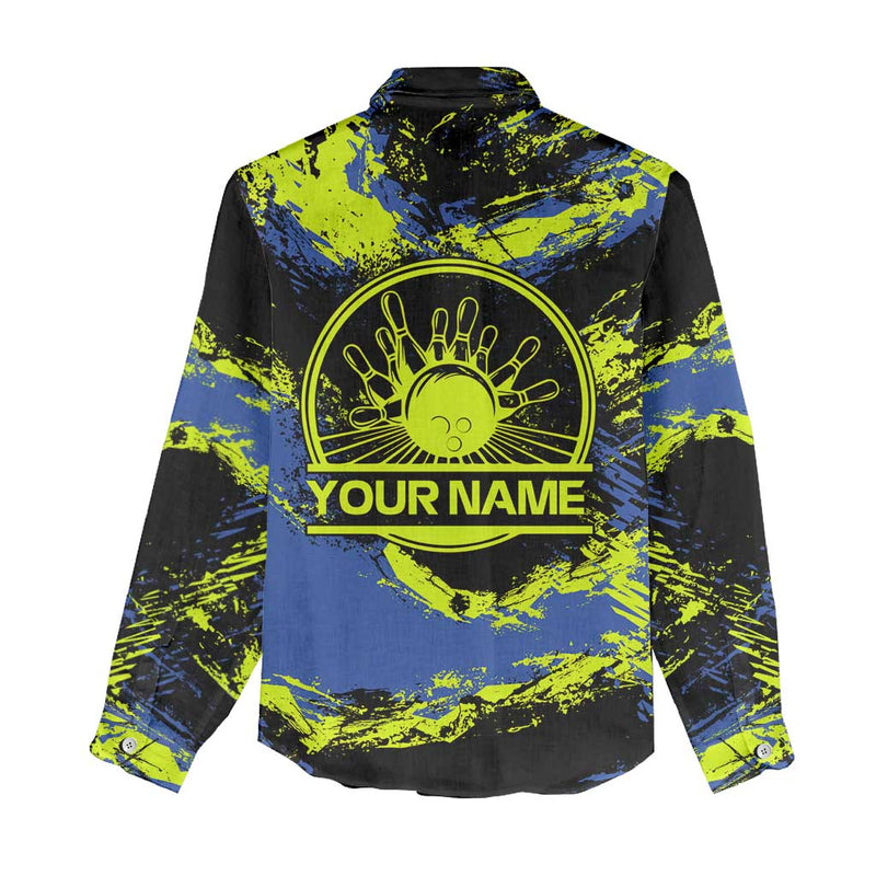 Abstract Blue and Yellow Bowling Ball Strike Design with Custom Name Print Women Casual Shirt