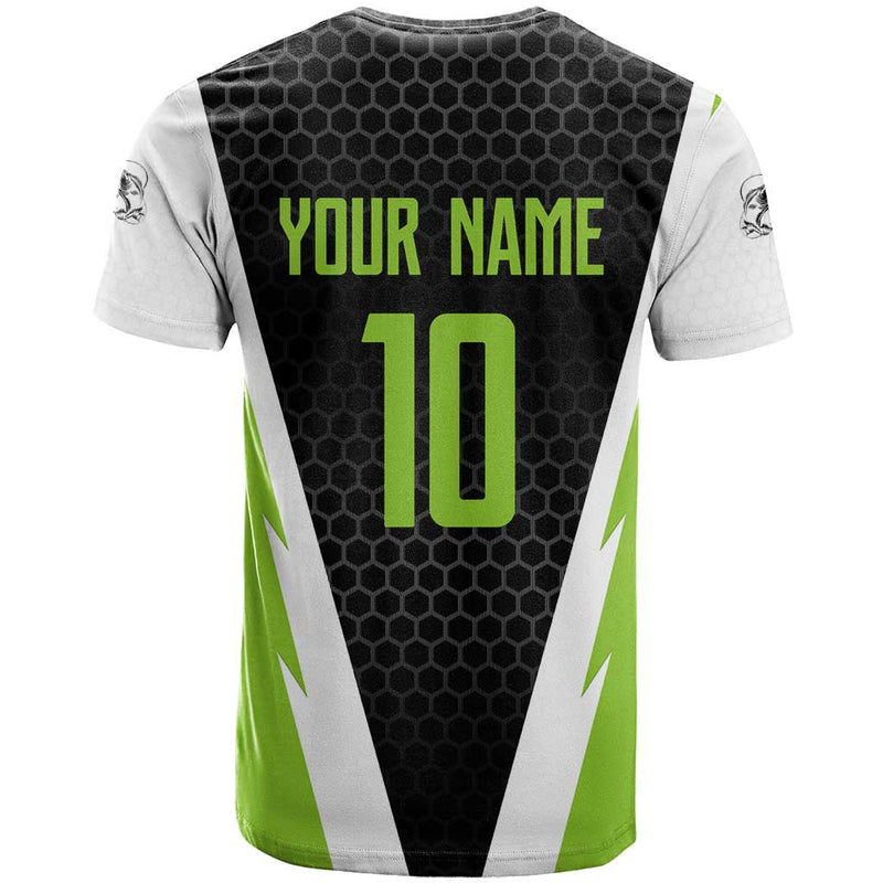 Custom Bass Fishing Jumping Fish Graphic and Green Black Honeycomb T Shirt